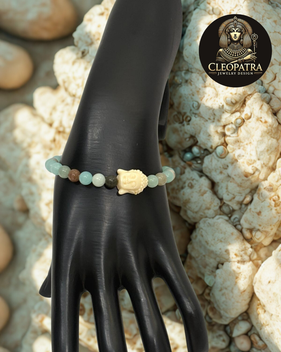 La Amazonita transmite calma, armonía y confianza, ayudando a liberar tensiones y abrir el corazón, mientras que el dije de Buda simboliza sabiduría, serenidad y despertar interior.